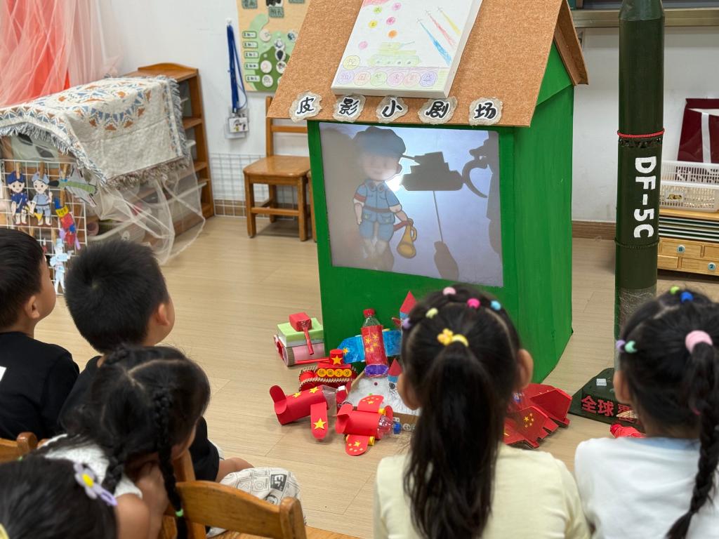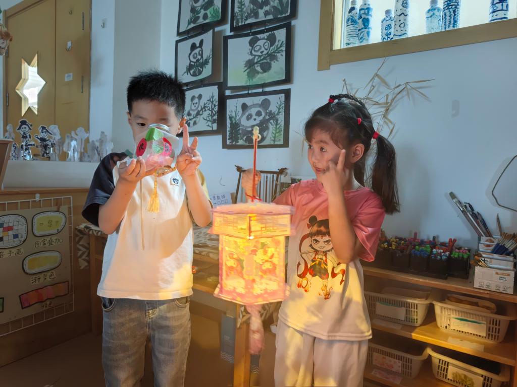 户外展示区里,花灯点亮、簪花亮相、皮影展演轮番上演,幼儿讲解员热情介绍创作思路,孩子们巡回参观打卡,与作品合影留念。凭打卡记录领取国庆主题小礼品的环节,更让节日喜悦氛围升温。