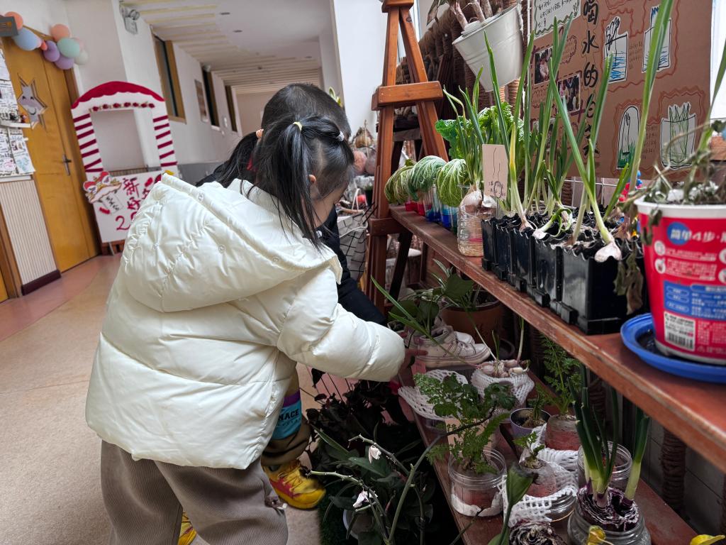早上来园,子由和雯雯发现植物角多了一个“新花盆”,上面种了净化空气的绿萝。