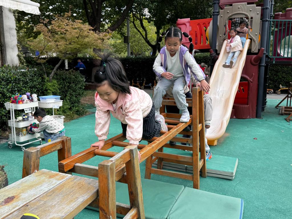 昕昕尝试在安吉梯上站起来往前走,一次勇敢的尝试。