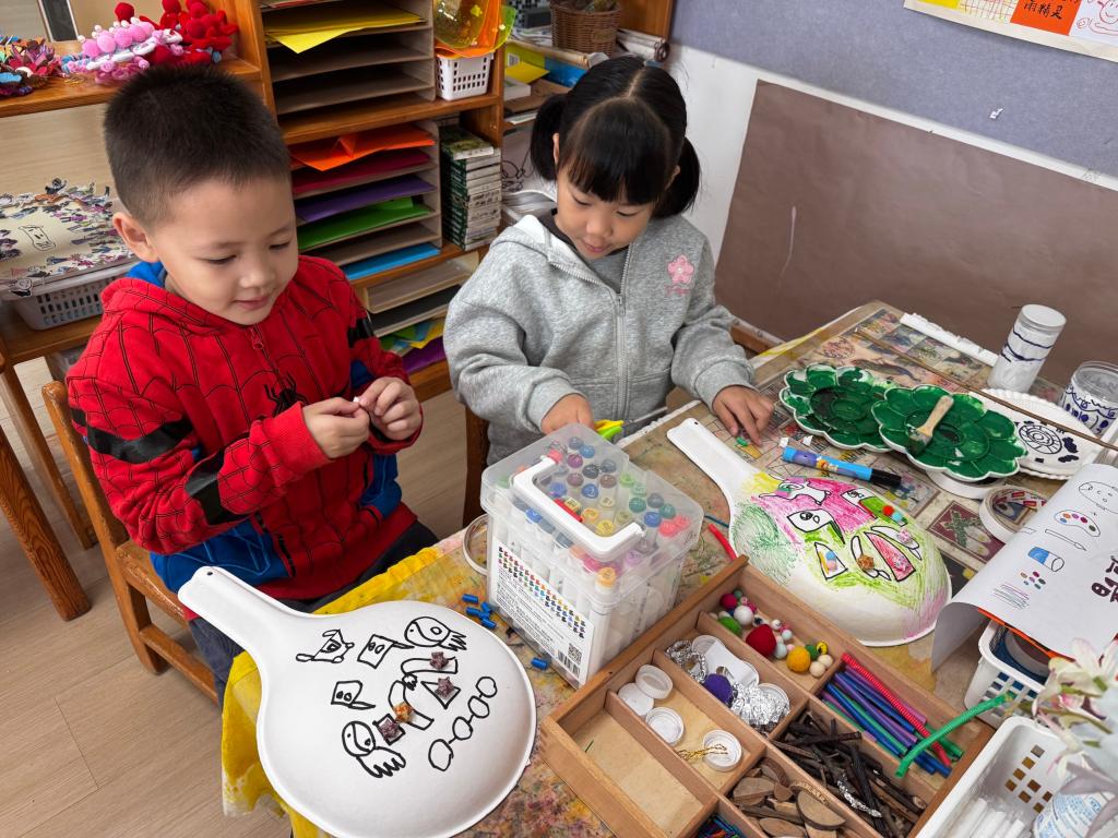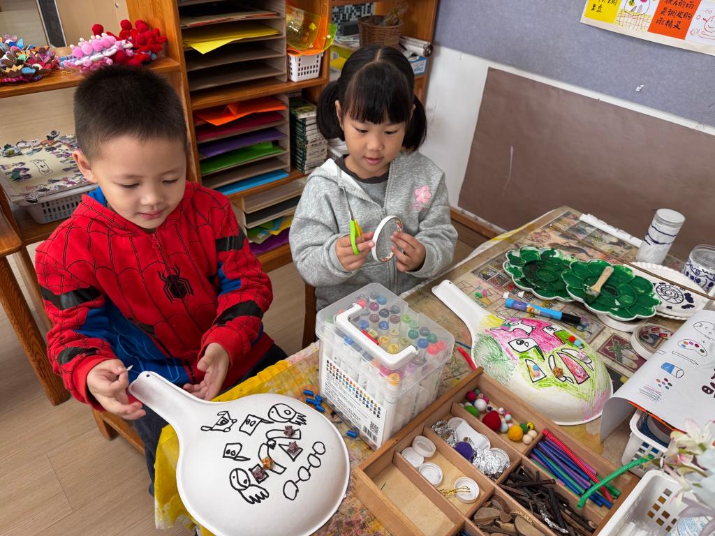 昊昊和筱筱在区域中用各种材料做一个京剧脸谱。